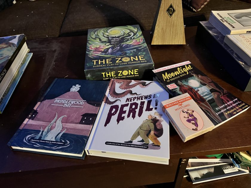 Still, I am fascinated by TTRPGs in general and enjoy time spent prepping and running them. I mix up genres and systems a lot. I also shuffle longer campaigns with mini-campaigns and with one-shots or two-shots. My favorite genre is horror, but I’ve run a lot of super hero, cozy, sci-fi, heroic fantasy, gritty drama, etc., with tones ranging from deeply sill to very bleak; cerebral to visceral; immersive to detached. My favorite campaign game ever was a recent run-though of the Delta Green campaign of God’s Teeth, even though it was heavy, and at times difficult. My favorite mini-campaign was a 3-arc/24 session game of Masks: A New Generation (which, overall, ran about as long as God’s Teeth). Close runners-up for mini-campaigns would be Tales from the Loop, City of Mist, and Velvet Glove. My favorite one-shot is harder to locate, because there have been so many, but I can think of standout sessions of Ten Candles, Bluebeard’s Bride, Kult, Yazeba’s Bed & Breakfast (technically GMless), Dialect (also GMless), World Wide Wrestling. I’ve had a few really good public pickup games, including runs of Dark Places & Demogorgons, Hypertellurians, and CyBorg—D20 systems all 3.